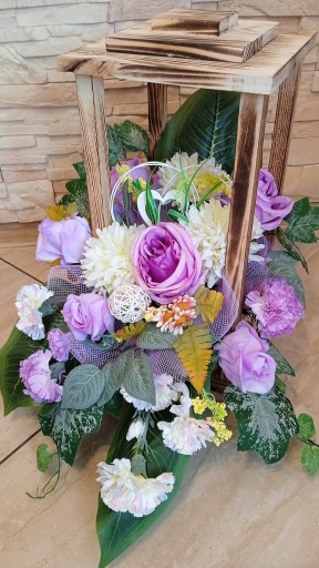 Kompozycja sztuczna (tzw. stroik, ikebana) jest wykonana NA LATARNI wykonanej w drzewa- co daje jej stabilność.