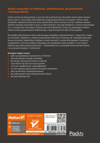 Oto książka, którą docenią i osoby rozpoczynające przygodę z programowaniem, i programiści znający już inne języki. Znajdziesz tu zarówno podstawowe informacje o Pythonie, jak i wskazówki dotyczące pisania rozszerzeń, dzięki którym będziesz w stanie korzystać z atutów kilku języków. Przydatnym uzupełnieniem są liczne przykłady, pokazujące, jak rozwiązywać częste problemy. To już czwarte wydanie tego praktycznego podręcznika ? docenianego za to, że pozwala dobrze poznać Pythona i uczy, jak pisać wydajny i czytelny kod.