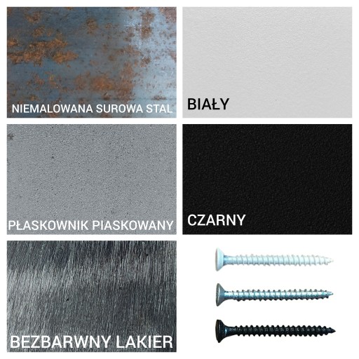 Płaskowniki są piaskowane, a następnie malowane proszkowo na kolor czarny mat, biały mat, bezbarwny (podkreśla urok surowej stali) lub inny kolor za dopłatą po uzgodnieniu. Możemy także wykonać wieszak z niemalowanej surowej stali.