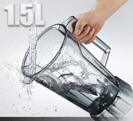 Ten cichy blender o dużej pojemności 1,5 l jest wyposażony w przezroczysty pojemnik z tworzywa PC klasy spożywczej, któremu towarzyszą precyzyjne linie podziałki. Maksymalna grubość pojemnika może osiągnąć 0,2" (6 mm).