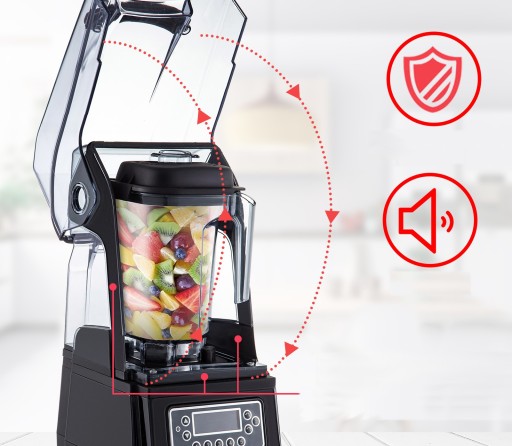 Dzięki specjalistycznej osłonie dźwiękowej i 3-stronnej warstwie dźwiękoszczelnej z żelu krzemionkowego możesz obsługiwać swój komercyjny blender przy znacznie zmniejszonej głośności (75-85 dB). Blender będzie działał tylko wtedy, gdy obudowa dźwiękowa jest zamknięta.