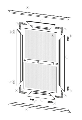 Do każdego zestawu moskitiery suwanej dołączona jest dołączona szczegółowa instrukcja składania i montowania moskitiery. W skład zestawu wchodzą: aluminiowy profil skrzydła moskitiery x4szt [2], narożniki wewnętrzne x4szt [3], naciąg - uszczelka x1szt [8], siatka z włókna szklanego x1szt [1], poprzeczka 1 szt [7], rolka jezdna x2szt [4], element prowadzący profilu głównego 4szt [5], szyna jezdna x2szt [6], narzędzie do wciskania uszczelki oraz instrukcja