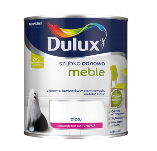 Dulux Szybka Odnowa MEBLE to wodorozcieńczalna farba do renowacyjnego malowania mebli. Jest łatwa w użyciu, ponieważ nie potrzebujesz podkładu. Produkt jest specjalnie dostosowany do Twojego obiektu i może być stosowany na praktycznie wszystkich powierzchniach. Farba charakteryzuje się wysoką odpornością powłoki na zarysowania i uderzenia. Jest łatwa do czyszczenia.