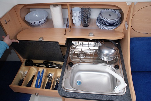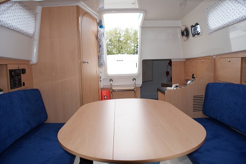 zbiorniki zatankowane - 44 litry paliwa (rozliczane po rejsie z kaucji), stolik w kokpicie, stół w kabinie,