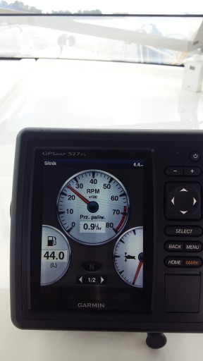 Ploter Garmin 527xs: sonda głębokości + prędkościomierz + obrotomierz, spalanie - dane z wtrysków, pozostała ilość paliwa, inne