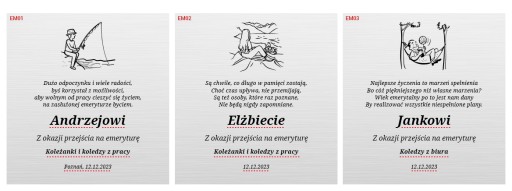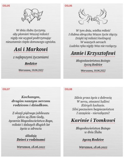 Możesz wybrać jeden z poniższych wzorów, podając jedynie wybrany numer oraz dane (podkreślone czerwoną linią), które należy zmienić lub możesz podesłać całkowicie własny tekst. Możesz również wybrać wzór obrazka, który może być umieszczony obok treści dedykacji. Jeżeli, chciałbyś umieścić na tabliczce własną grafikę najpierw wyślij ją nam do weryfikacji, czy da się ją umieścić.