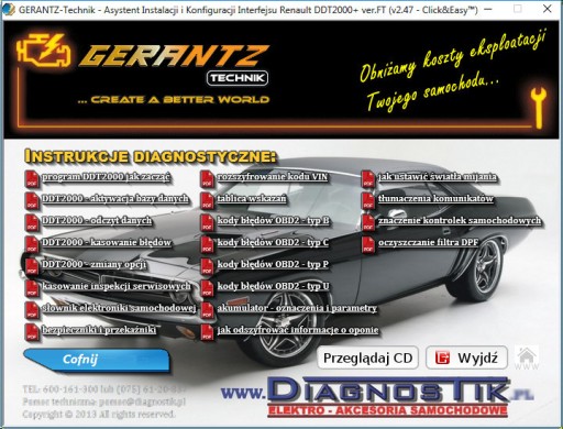 (instrukcje, lokalizacje złącz diagnostycznych w poszczególnych autach, porady diagnostyczne, w tym: kasowanie kontrolek inspekcji serwisowych i olejowych, kody błędów.) oraz nasz autorski program: Asystent Instalacji i Konfiguracji Urządzenia w wersji 2.47, z TECHNOLOGIĄ Click&Easy™