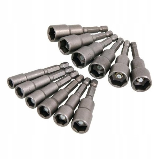 Zestaw 12 nasadek magnetycznych do wkrętarki. Wykonane z utwardzanej stali chromowo-wanadowej. Magnetyczne końcówki zapewniają bezpieczne trzymanie śruby/nakrętki.