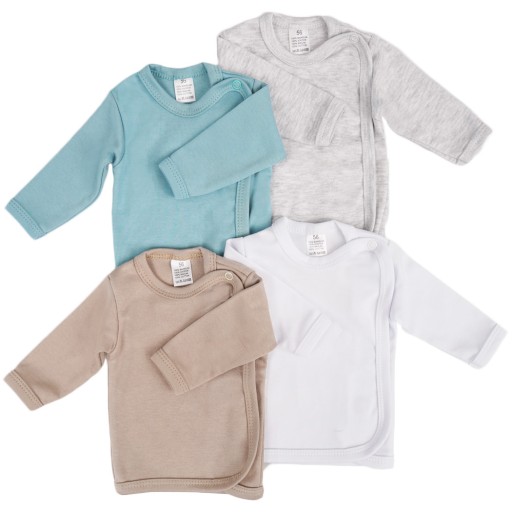 4PAK koszulek kopertowych dla niemowląt zapinanych na napki - iceberg, piaskowy, biały i szary melanż.