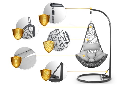 - wzmocniony zaczep fotela, solidny łańcuch i hak mocujący ze sprężyną!