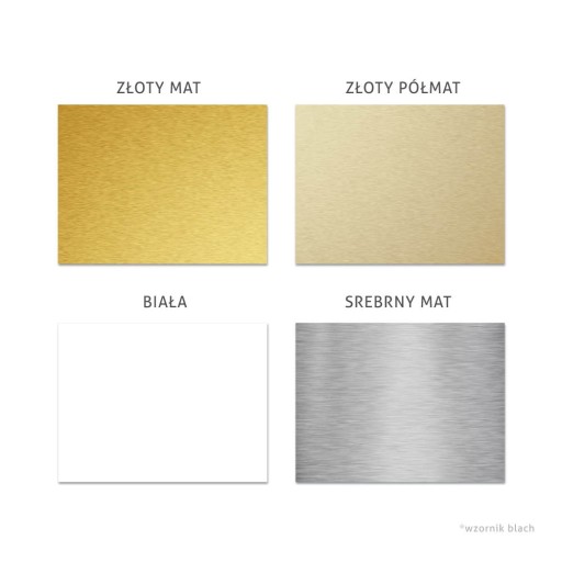 - Kolor blaszki: srebrny mat, złoty mat, złoty półmat, biały
