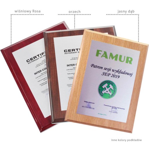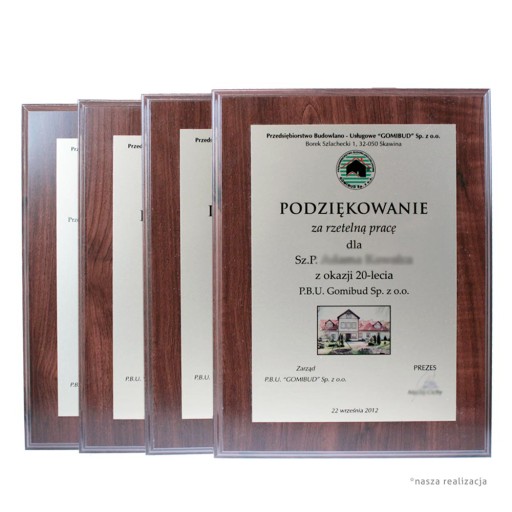 Idealny, aby wyrazić podziękowania, jako forma dyplomu lub certyfikatu czy na pamiątkę wygranej. Drewniany podkład MDF w kolorze orzecha stanowi solidną podstawę, wytrzymałą na upływ czasu i mechaniczne uszkodzenia. Napis drukowany w kolorze na eleganckiej blaszce jest bardzo trwały i odporny na ścieranie.