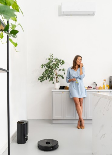 - funkcje: automatyczne opróżnienie pojemnika / automatyczny powrót do bazy / tryb odkurzania dywanu / zintegrowane zbiorniki na kurz i na wodę
