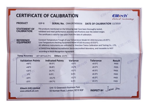 Każdy rejestrator posiada certyfikat kalibracji czujnika temperatury przypisany do konkretnego egzemplarza, który dostarczony jest razem z rejestratorem.