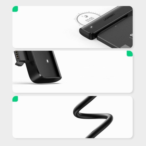 Adapter marki Ugreen ze złączem USB Typ C 3.2 Gen 1 do podłączenia do komputera dysków HDD i SSD (tylko 2,5'') z interfejsem SATA. Układ scalony najnowszej generacji, wspierający technologię USB Typ C 3.2 Gen 1 jest gwarancją super szybkiego przesyłania danych, niezawodności i bezpieczeństwa twojego sprzętu. Do używania tej przejściówki nie są potrzebne żadne sterowniki, działa na zasadzie Plug&Play.