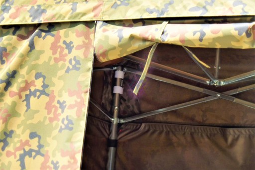 - Możliwość podwinięcia materiału i podwiązania go na dołączonych trokach - tworząc "drzwi" do namiotu
