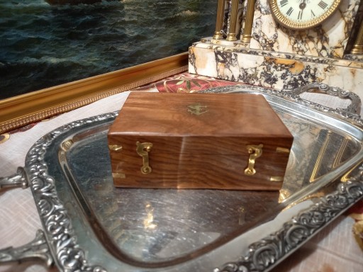 Zestaw sześciu kieliszków mosiężnych w pudełku z drewna palisandrowego