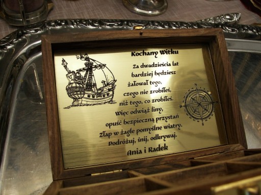 Personalizacja z pewnością podniesie wartość sentymentalną tego zestawu. Grawerunek bezpośrednio na drewnie na pokrywie która jest gładka lub wewnątrz pokrywy na złotym laminacie. Ilość znaków i grafiki nie ma znaczenia, cena jest taka sama