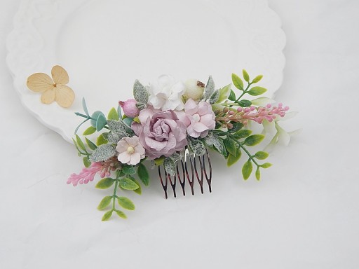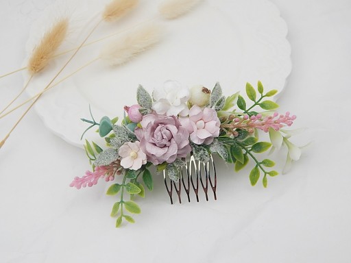 wyjątkowy grzebyk zdobiony delikatnymi kwiatami z dodatkiem zielonych gałązek.