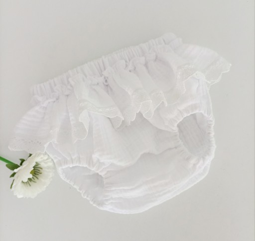 Majteczki bloomers w kolorze białym rozmiar 74.Kolor biały. Muślin bawełniany 100%.Majteczki zakryją pieluszkę, pięknie komponują się w zestawie z sukienką.