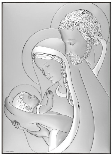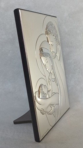 Srebrny obrazek przedstawiający wizerunek Świętej Rodziny. Doskonały prezent z okazji narodzin Dziecka, na Chrzest, I Komunię, Bierzmowanie, dla Pary Młodej z okazji Ślubu, na Rocznicę Ślubu, jako pamiątka dla rodziców Młodej Pary czy jako ozdoba.