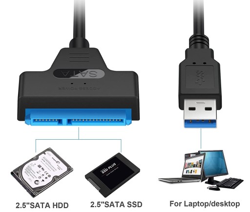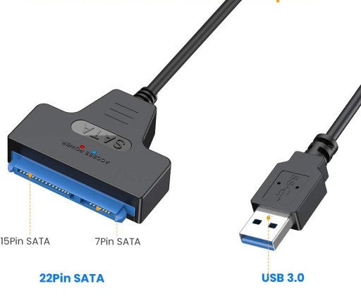 Kabel posiada wejście SATA (22 pin) na USB 3.0 można podłączyć dysk bezpośrednio i poprzez adapter do dysku SSD