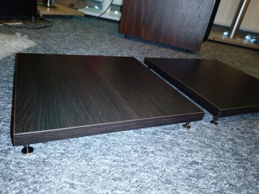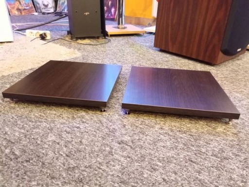 PODSTAWKI O WYS. całkowitej OKOŁO 5 CM - i wymiarach uniwersalnych 29,2cm X 29,2cm (292mm) bardzo uniwersalnych pasujących praktycznie do każdych kolumn domowych..Na foto ogromne kolumny POLK t-50. Na dole kolumny Wilson raptor 5. -koloru białego.