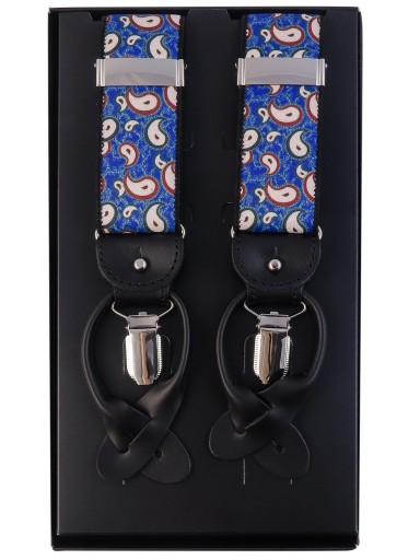 Niebiesko-czerwone szelki we wzór paisley na żabki i na guziki.
