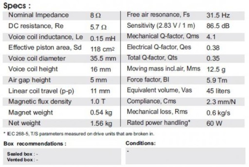 - basreflex z rurą o średnicy około 38 mm i długości 152 mm, objętość około 14 litrów dla F3 wynoszącego 47 Hz.