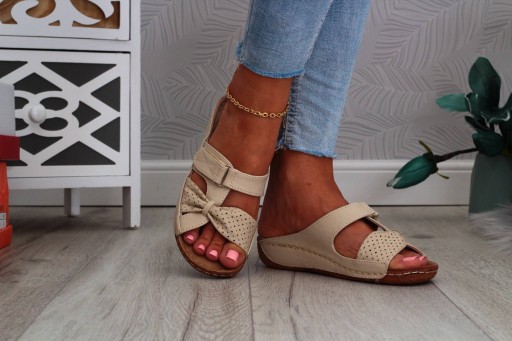 Damskie klapki w kolorze beżowym na delikatnym koturnie z zapięciem na rzep. Wkładka profilowana, wykonana ze skóry naturalnej. Szyta podeszwa skutkuje dłuższą wytrzymałością. Prosty fason pasuje do wielu stylizacji.