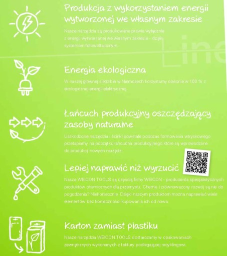Co możemy uczynić, aby zapewnić zrównoważoną przyszłość? To pytanie zadaje sobie nie tylko wiele osób w domu, ale także coraz więcej firm. My również w firmie WEICON zajmujemy się tym tematem od wielu lat. Dlatego właśnie stworzyliśmy WEICON TOOLS Green Line. Pod względem jakości w niczym nie ustępują one naszym klasycznym narzędziom, są tak samo wytrzymałe i trwałe.