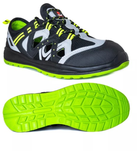 Sandały ochronne o atrakcyjnym ,nowoczesnym wzornictwie, wykonane w całości z mikrofibry w kolorze czarno-szarym z elementami odblaskowymi oraz seledynowymi akcentami. Charakteryzują się wysokim poziomem cyrkulacji powietrza. Wyposażone w szeroki podnosek stalowy, wytrzymały na uderzenia z energią 200 J oraz zgniecenia do 15 kN oraz gumową podeszwę o właściwościach antyelektrostatycznych, olejoodpornych, antypoślizgowe SCR z wkładką antyprzebiciową 1100N . Wyściółka zapobiegająca otarciom oraz gruby i miękki język buta zapewnią użytkownikom wysoki komfort podczas noszenia obuwia. Idealne na sezon wiosna/lato.
