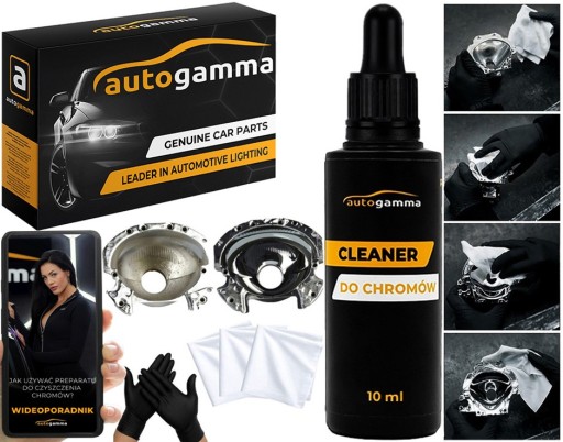 Preparat do czyszczenia chromów Auto Gamma do usuwania zanieczyszczeń i nalotów, doskonały przy zastosowaniu maszyny do polerowania jak i do użycia ręcznego, przy pomocy gładkiej ściereczki. Po wyczyszczeniu chromu na odbłyśnikach, powierzchnia jest nie tylko czysta, ale i błyszcząca dzięki czemu twoje lampy ponownie doświetlą drogę. Niewielką ilość preparatu należy nanieść na ściereczkę i przystąpić do czyszczenia zabrudzonej powierzchni aż do momentu uzyskania oczekiwanego efektu.