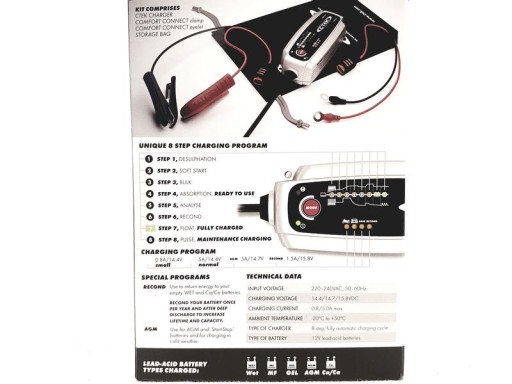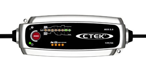 Ładowarka mikroprocesorowa Ctek MXS 5.0 to ładowarka wykorzystująca najnowszą technologię, która wcześniej była stosowana wyłącznie w profesjonalnych produktach CTEK. Ładowarka zapewnia wszechstronne rozwiązanie do ładowania akumulatorów, także w przypadku zastosowań o wysokich wymogach. MXS 5.0 oferuje takie funkcje, jak diagnoza akumulatora sygnalizująca czy akumulator może otrzymać i utrzymać ładunek, regenerację umożliwiającą odnowę całkowicie rozładowanych akumulatorów z rozwarstwionym elektrolitem, unikalne ładowanie podtrzymujące, tryb optymalnego ładowania w niskich temperaturach oraz ładowanie wymagających akumulatorów AGM (np. Optima). Na wyświetlaczu wyświetlane są dla użytkownika wszystkie instrukcje dotyczące procedury ładowania. Ładowarka MXS 5.0 to całkowicie automatyczna 8-etapowa ładowarka zapewniająca ładowanie akumulatorów 0.8 A lub 5 A do 12 V od 1.2-110 Ah umożliwiająca także ładowanie podtrzymujące do 160 Ah. Ładowarka posiada klasę IP 65 (ochrona przed wodą i pyłem) i została zaprojektowana w celu zabezpieczenia samochodowych podzespołów elektronicznych, wraz z zabezpieczeniem przed iskrzeniem i odwrotną biegunowością oraz ochroną przeciwzwarciową. Ładowarka jest objęta 5-letnią gwarancją producenta.