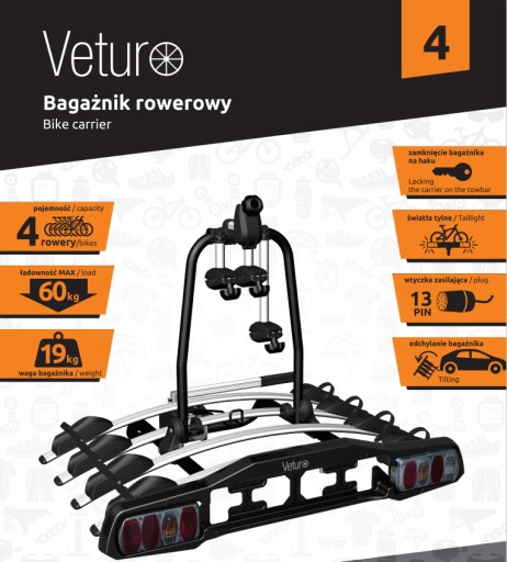 Veturo 4 to uniwersalny bagażnik na rowery pasujący do każdego auta wyposażonego w hak. Produkt przystosowany jest do przewożenia czterech osobno zapinanych rowerów każdego typu. Maksymalna masa obciążenia bagażnika to około 60 kg. Bardzo wygodną opcją jest możliwość uchylania platformy aby dostać się w szybki sposób do bagażnika bez konieczności ściągania całego bagażnika. Platforma wyposażona jest w pełne zabezpieczenie przez kradzieżą (zabezpieczenie na kuli haka oraz każdego roweru z osobna)