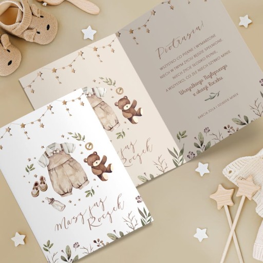 - Kartka z życzeniami to wyjątkowy prezent na roczek. Na okładce i środku widnieje grafika zachowana w stylu boho.