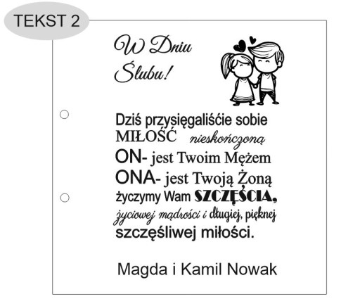 Przykład (wzór2, tekst 1, imiona pary młodej Agata i Szymon data ślubu 07.07.2022, podpis - Julia i Karol Nowak)