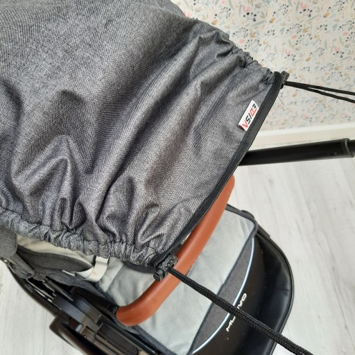 Mocowanie za pomocą gumy (naciągana na budkę wózka) i troczków ze stoperami do regulacji.