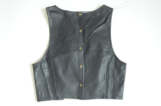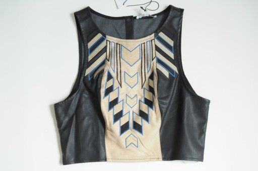 Piękny top marki GLAMOROUS, eko - skóra z azteckimi haftowanymi wzorami na przodzie, tył zapinany na metalowe zatrzaski, lekko elastyczny. Piekny do spodni ze skóry z wyższym stanem! Nie czekaj az inni go wykupią!