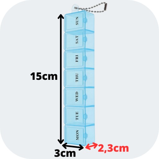 Każda z siedmiu przegród jest opisana dniem tygodnia w skrócie po angielsku, dzięki czemu bez trudu można odczytać, jaki lek należy przyjąć danego dnia. Pojemnik posiada również łańcuszek, który umożliwia zawieszenie go na haczyku lub przyczepienie do kluczyków.