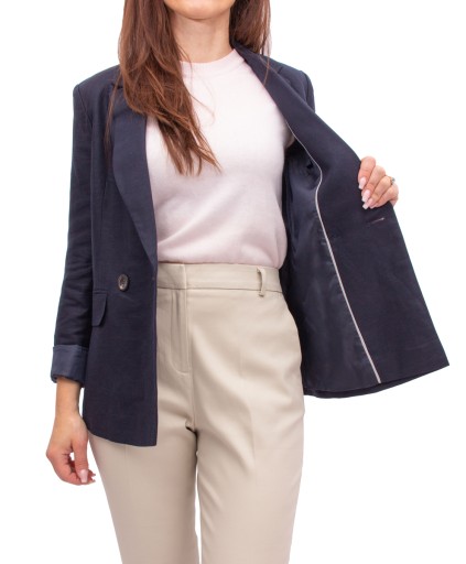 Ponadczasowy żakiet damski o swobodnym fasonie wykonany z materiału zawierającego len.