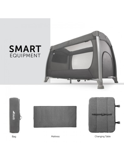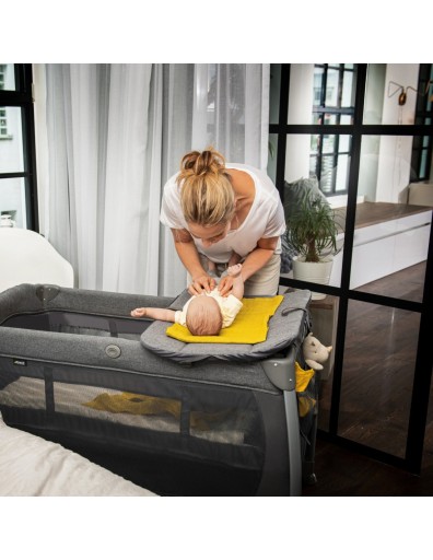 7-częściowy zestaw Play N Relax Center może być używany od pierwszych dni życia dzięki dostawce dla niemowląt oraz przewijakowi. Stożkowy kształt łóżeczka sprawia, że jest bardzo stabilne i odporne na przechylenie, a kółka umożliwiają przesuwanie łóżka. Ponadto łatwy montaż i składanie sprawia, że idealnie nadaje się na podróże lub wizyty u babci i dziadka.