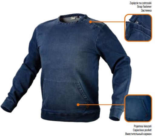 Bluza robocza z kolekcji NEO DENIM zaprojektowana w Polsce przez technologów odzieży NEO, z myślą o każdym szczególe i zachowaniu stylu. Wygodna i praktyczna - duża kieszeń typu kangurka na przydatne narzędzia lub telefon. Jakość ubrania roboczego świetnie sprawdzi się jako ubiór codzienny