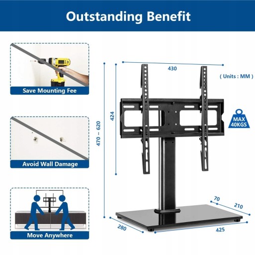- Stabilność: rozmiar podstawy telewizora wynosi 425 mm x 280 mm i zapewnia więcej miejsca na komponenty AV. Nośność uchwytu wynosi maksymalnie 40 kg. Szkło hartowane o grubości 8 mm jest bezpieczne i stabilne, aby utrzymać sztangę. Nakładki na podłogę zwiększają stabilność i chronią przed zarysowaniami.