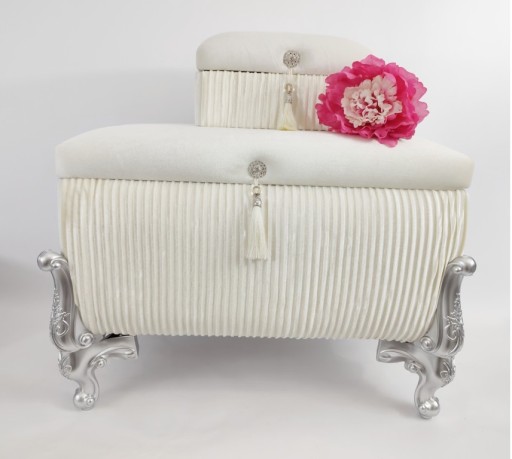 Pikowany wzór i kryształki oraz stylowe nogi w stylu Glamour nadają meblowi bardzo oryginalny wygląd i czynią go ozdobą swojego pokoju czy sypialni. Najmniejszy kuferek na nóżkach bez pokrywy idealnie sprawdzi się na kosmetyki oraz perfumy.