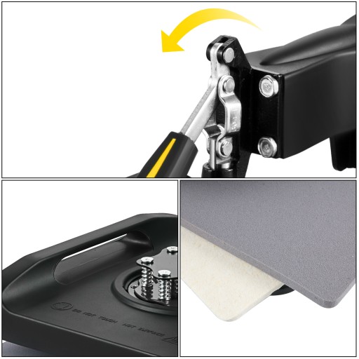 【360° SWING AWAY DESIGN】-odchylane ramię sprawia, że nacisk jest wywierany bezpośrednio i równomiernie na maszynę do sublimacji, poprawiając jakość transferu. Tymczasem umożliwia przesuwanie się elementu grzejnego na bok, zmniejszając ryzyko przypadkowego kontaktu.