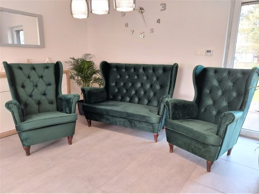 PIĘKNY DUŻY ZESTAW SOLIDNA SOFA DWUOSOBOWA NA DREWNIANYCH NOGACH + 2 FOTELE USZAK W WYBRANYM KOLORZE Z DREWNIANYMI NÓŻKAMI WZÓR PIKOWANIA OPARCIA PIKOWANIE POPRZECZNE GUZIKI