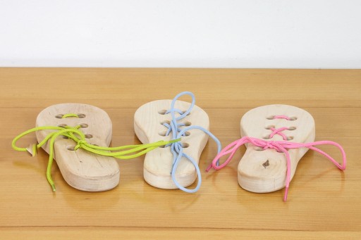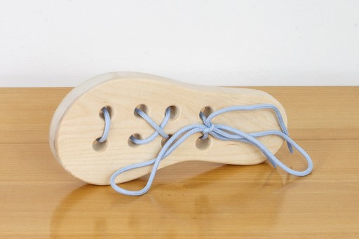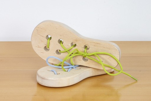Деревянная колодка для обучения завязыванию учебной обуви.