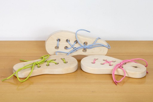 Drewniany sznurowany bucik – zabawka, która rozwija zdolności manualne oraz pomaga dzieciom w nauce wiązania butów.