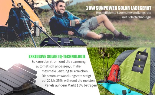 - ▶ Podwójny zasilacz USB: Przenośna ładowarka solarna 20 W zapewnia wystarczająco dużo energii, aby jednocześnie ładować telefon i tablet.